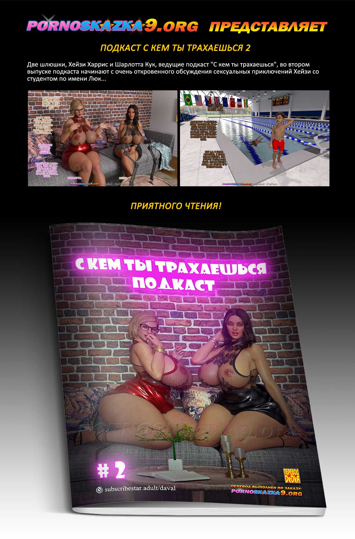 Порно комикс «Подкаст С кем ты трахаешься. Часть 2.» Две шлюшки, Хейзи Харрис и Шарлотта Кук, ведущие подкаст «С кем ты трахаешься», во втором выпуске подкаста начинают с очень откровенного обсуждения сексуальных приключений Хейзи со студентом по имени Люк…